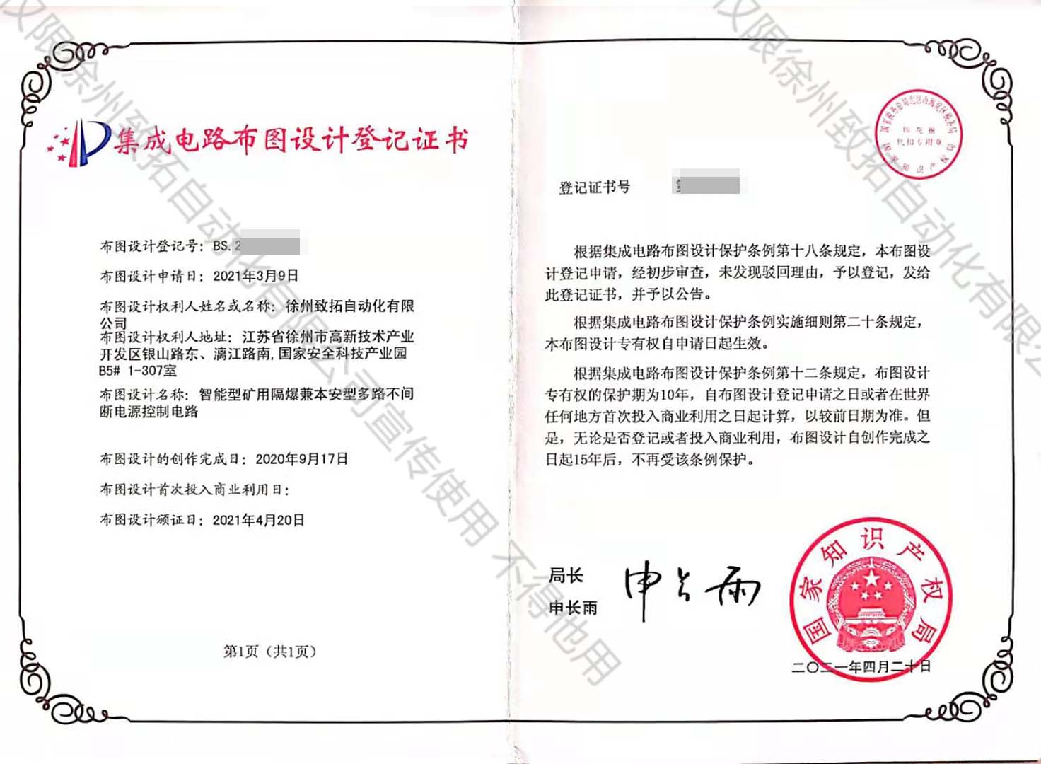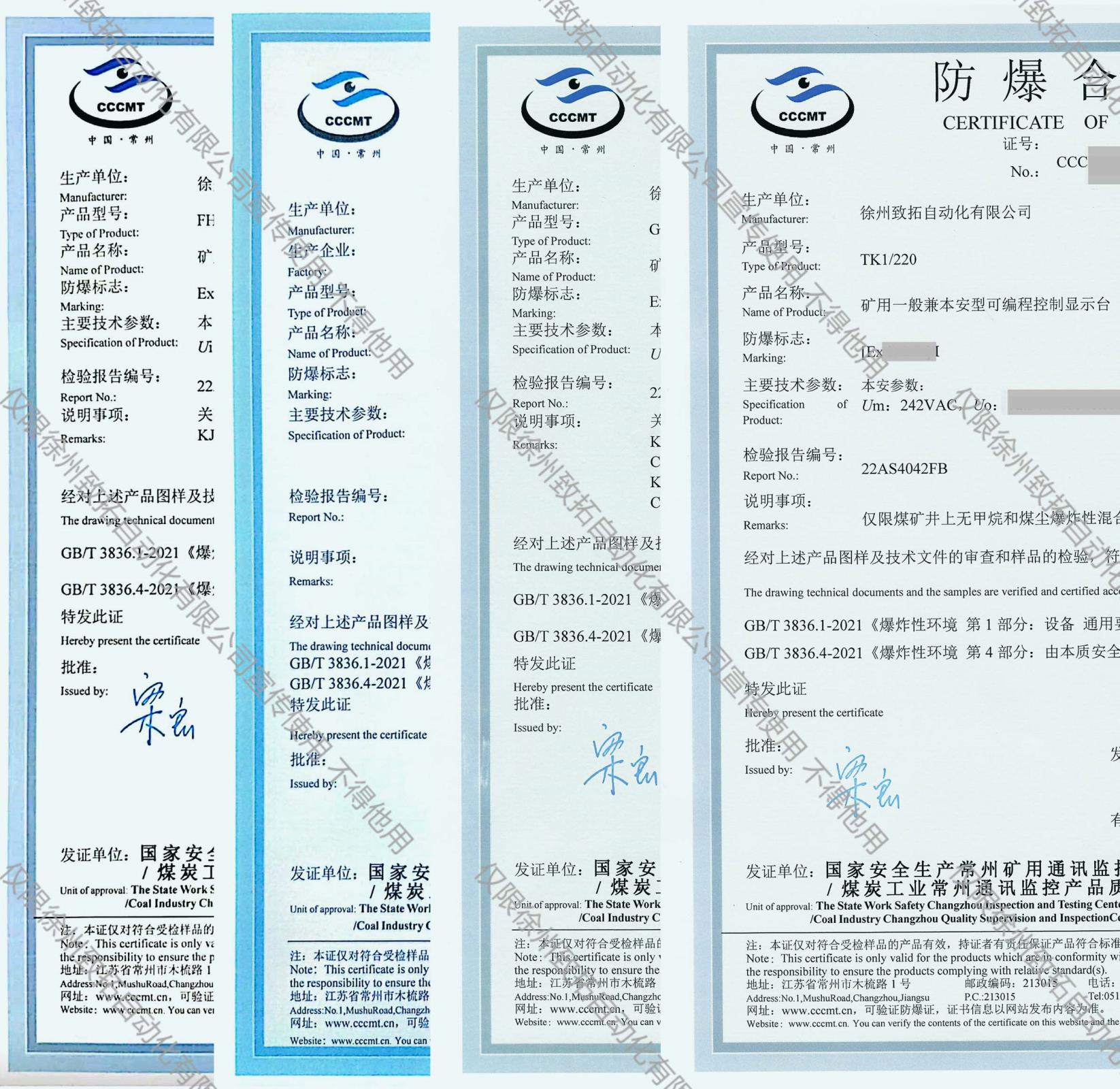 礦用隔爆兼本安型多路不間斷電源控制電路登記證書