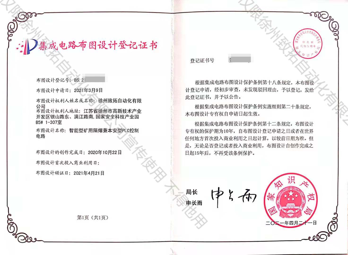 礦用隔爆兼本安型PLC控制電路設(shè)計登記證書